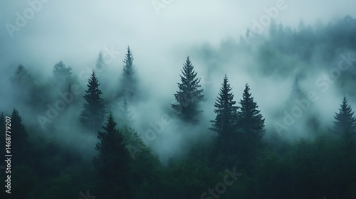 Misty forest scene, serene and mysterious.