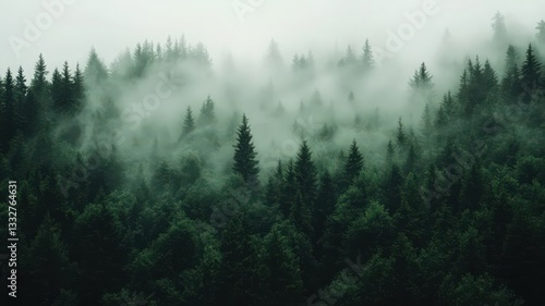 Misty Green Forest Landscape: Elevated View of Dense Evergreen Trees in Fog