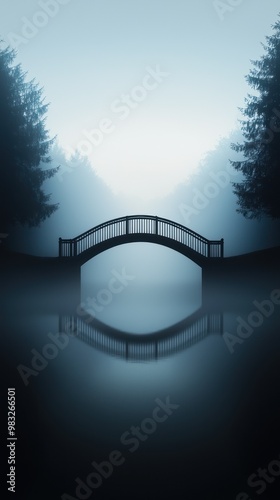 Misty landscape with a serene bridge and tranquil water reflection.