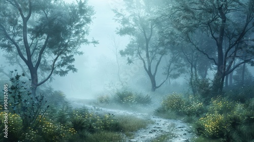 Misty morning in a tranquil forest with a winding path, evoking a sense of mystery and peace