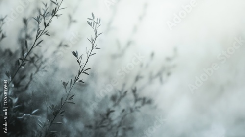 Misty morning plants, subtle grey tones, nature background, serene scene