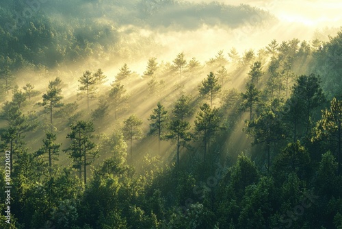 Misty morning sunrise over tranquil lake, mountains reflected in still water, sun peeking through clouds