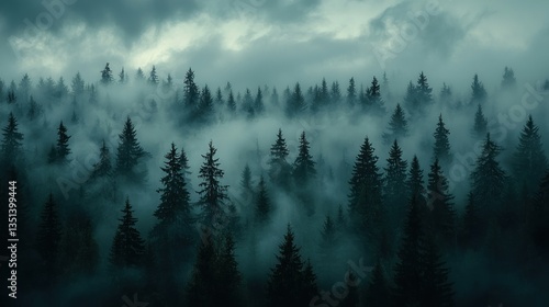 Misty mountain forest, aerial view, dramatic sky, nature's beauty