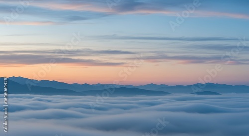 Misty mountain horizon at dawn, cool blue and gray tones, serene backdrop