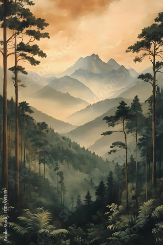 Misty Mountain Illustration: Serene Forest Landscape