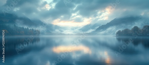 Misty Mountain Lake with Reflective Water Surface and Cloudy Sky