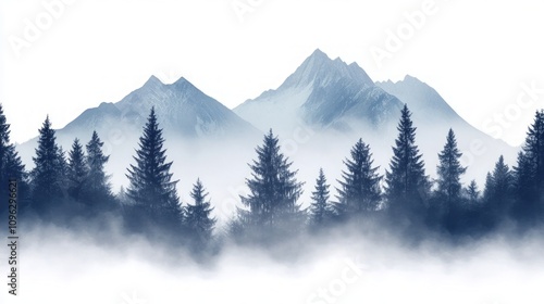 Misty Mountain Landscape with Silhouette Trees