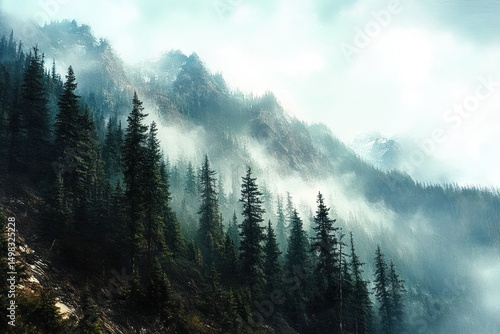 Misty mountain landscape with tall pine trees on rocky slopes under a soft cloudy sky, evoking calm and serene atmosphere