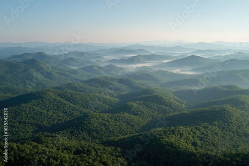 Misty mountain range at dawn. Lush green hills fade into hazy blue distance
