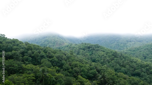 Misty mountain valley covered with dense green forest under cloudy sky, showing natural wilderness, lush landscape, and peaceful untouched nature environment