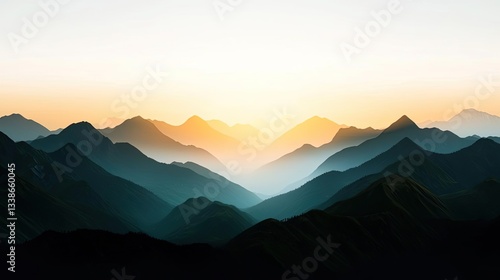 Misty mountains scenic view landscapes concept. Breathtaking mountain landscape at sunrise with misty peaks and soft light hues.