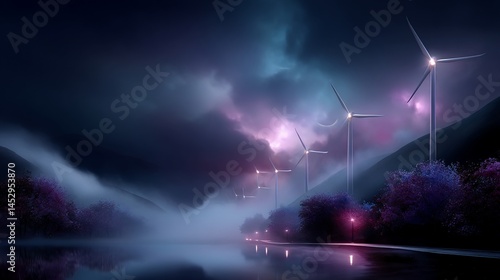Misty night, wind farm