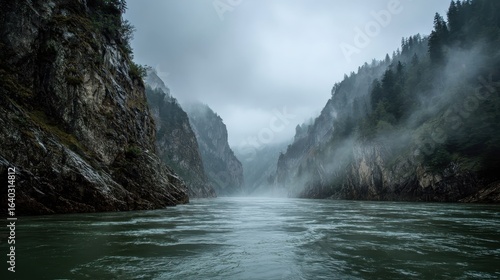 Misty River Gorge: Dramatic Cliffs, Foggy Forest, and Serene Water