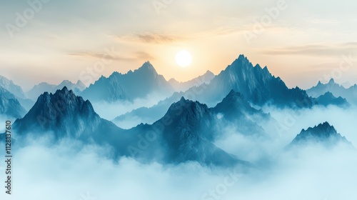 Misty Sunrise Over Ethereal Mountain Landscape Majestic Peaks Nature Scene Tranquil Environment Aerial View Dreamlike Atmosphere