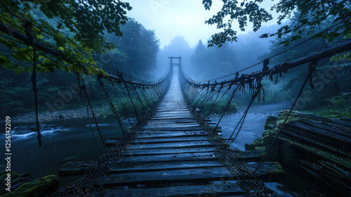 Misty suspension bridge over a tranquil river surrounded by lush greenery and fog