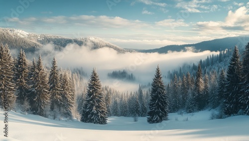 Misty Winter Forest with Snowy Hills and Mountain Background. Tranquil Lake Reflecting Clear Blue Sky Nature Landscape