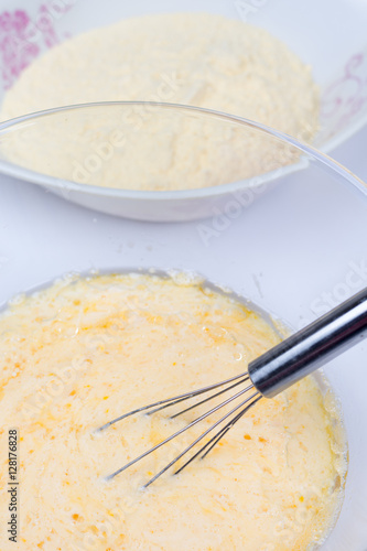 Mixed whisked eggs with wire isolated over white