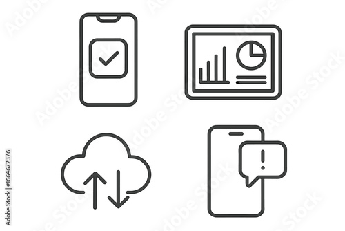 Mobile app icons set outline, smartphone with checkmark, tablet with dashboard charts, cloud sync arrows, mobile notification alert, digital business technology vector