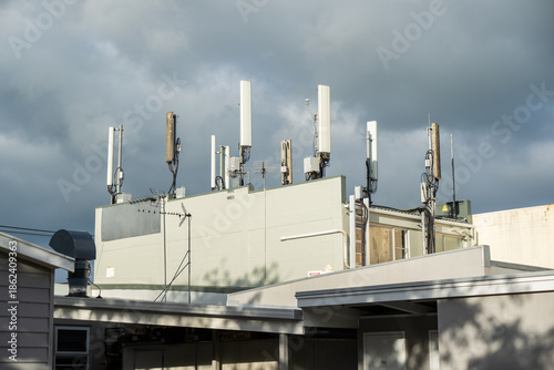 Mobile phone towerGMS cellular communication towers mounted on the rooftop of a commercial shop building, featuring multiple antennas and transmission equipment against an urban skyline.