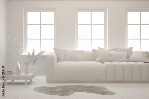 Mock up of minimalist living room in white color with sofa. Scandinavian interior design. 3D illustration