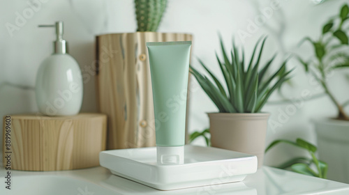 Mock up of toothpaste in a plain green tube on a bathroom shelf, minimalist bathroom background, Ai generated Images