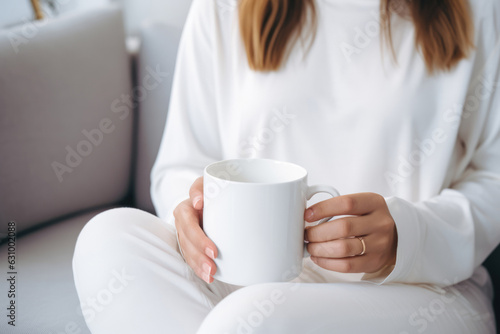 Mock Up Womans Hand Holds White Cup In Closeup In Modern, Bright Apartment