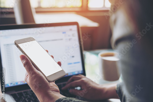 Mockup image of a woman holding mobile phone with blank white screen while using laptop with coffee cup on the table in office