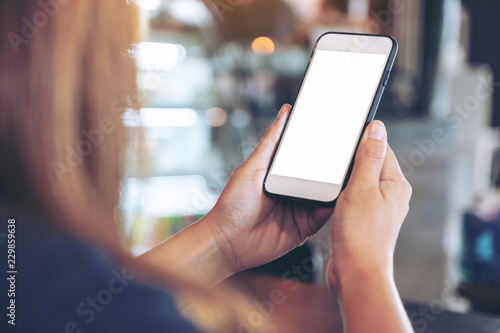 Mockup image of a woman holding white mobile phone with blank desktop screen with blur background