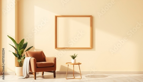 mockup picture frame on wall in minimalist bright interior with brown armchair, small table and houseplant