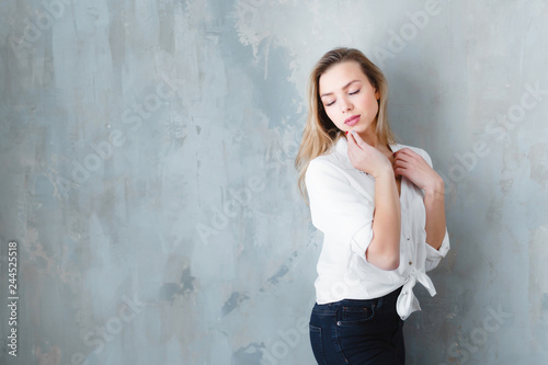 Model blonde blue jeans white shirt standing gray wall by window copy space.