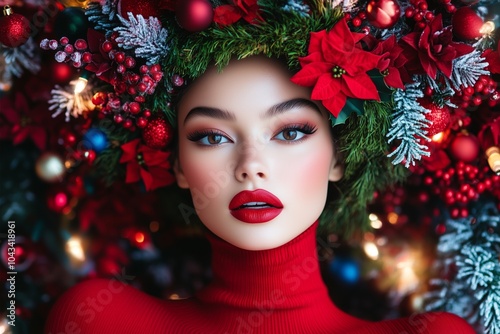 model with an elegant red turtleneck, wearing a Christmas wreath on her head and bold lipstick makeup