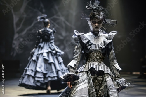 Models in elaborate gothic attire posing on a dark, moody theatrical set