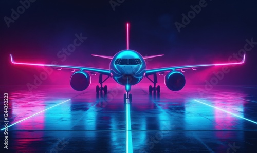 Modern airplane glowing under dynamic neon lights, symbolizing future-focused aviation and exploration.