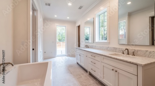 Modern and Spacious Bathroom with White Vanity, Natural Light, and Elegant Marble Countertop in a Contemporary Home Setting