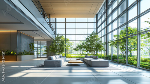 Modern and spacious office lobby with large Windows and seating area with sofa