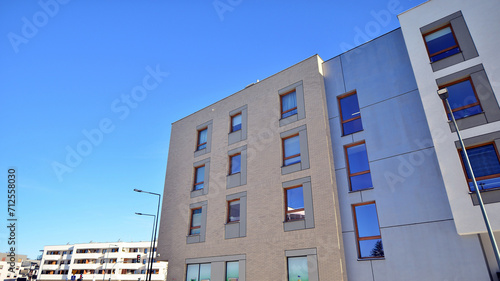 Modern apartment building in sunny day. Exterior, residential house facade. Residential area with modern, new and stylish living block of flats.