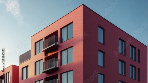 Modern Apartment Building with Red Facade and Balconies at Sunset