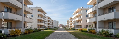 Modern apartment buildings lining a paved walkway.