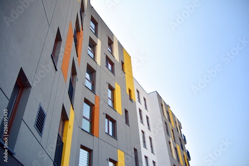 Modern apartment buildings on a sunny day with a blue sky. Facade of a modern apartment building