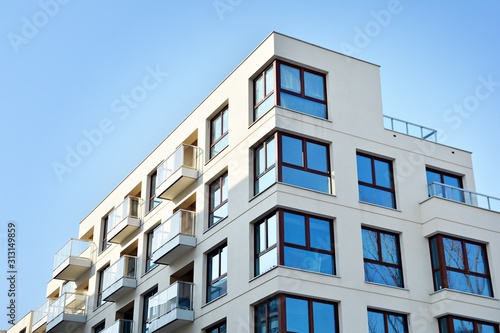 Modern apartment buildings on a sunny day with a blue sky. Facade of a modern apartment building.