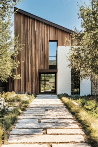 Modern architectural design featuring a wood and white facade, surrounded by lush greenery and a stone pathway in bright daylight