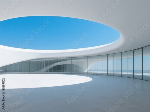 Modern Architectural Interior with Curved Skylight and Floor-to-Ceiling Windows