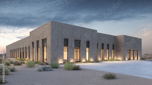 Modern Architectural Structure in Desert Landscape at Dusk