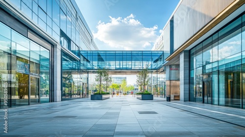 Modern Architecture with Glass Facades and Pedestrian Bridge