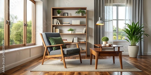Modern Armchair in a Minimalist Living Room with Wooden Table and Bookshelf - Ideal Setup for a Comfortable Home Office Environment