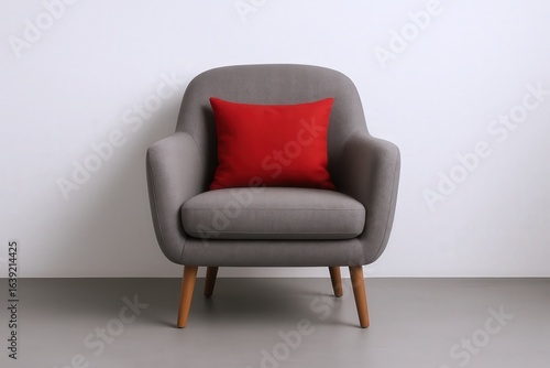 Modern Armchair with a Vibrant Red Accent Pillow, Offering Comfort and Contemporary Style in a Minimalist Setting