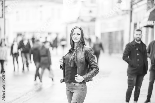 Modern attractive woman standing on a street close up portrait, woman touching hair, behind her are passers-by on the street, she enjoys life
