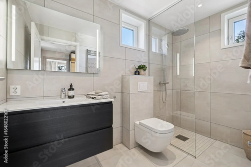 Modern bathroom interior in minimal scandinavian style, 3d render