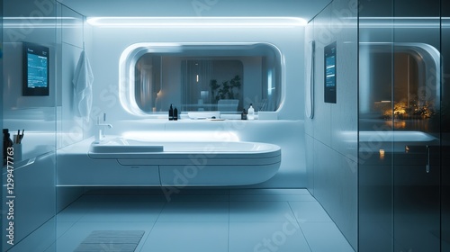 Modern bathroom interior. White tones. Bathtub and mirrors inside. Clean design and bright light. Minimalist style. Interior architecture and design.