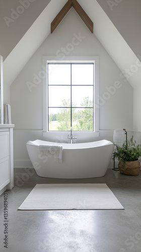 Modern bathroom interior with freestanding bathtub, large window showcasing natural landscape, and textured rug. Clean lines and minimalist design convey serenity and relaxation